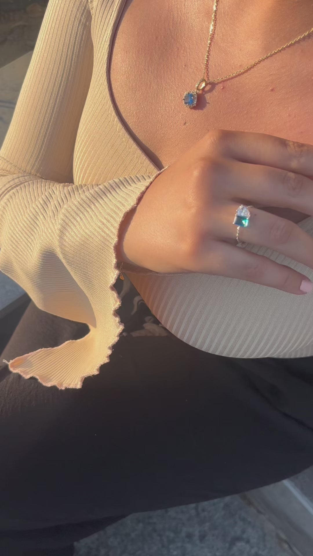 Crafted from premium 925 sterling silver and plated in radiant gold, the necklace features a deep blue topaz stone that captures the mystery of London skies, while the ring boasts a rich green pear-shaped emerald — a symbol of luxury and renewal.